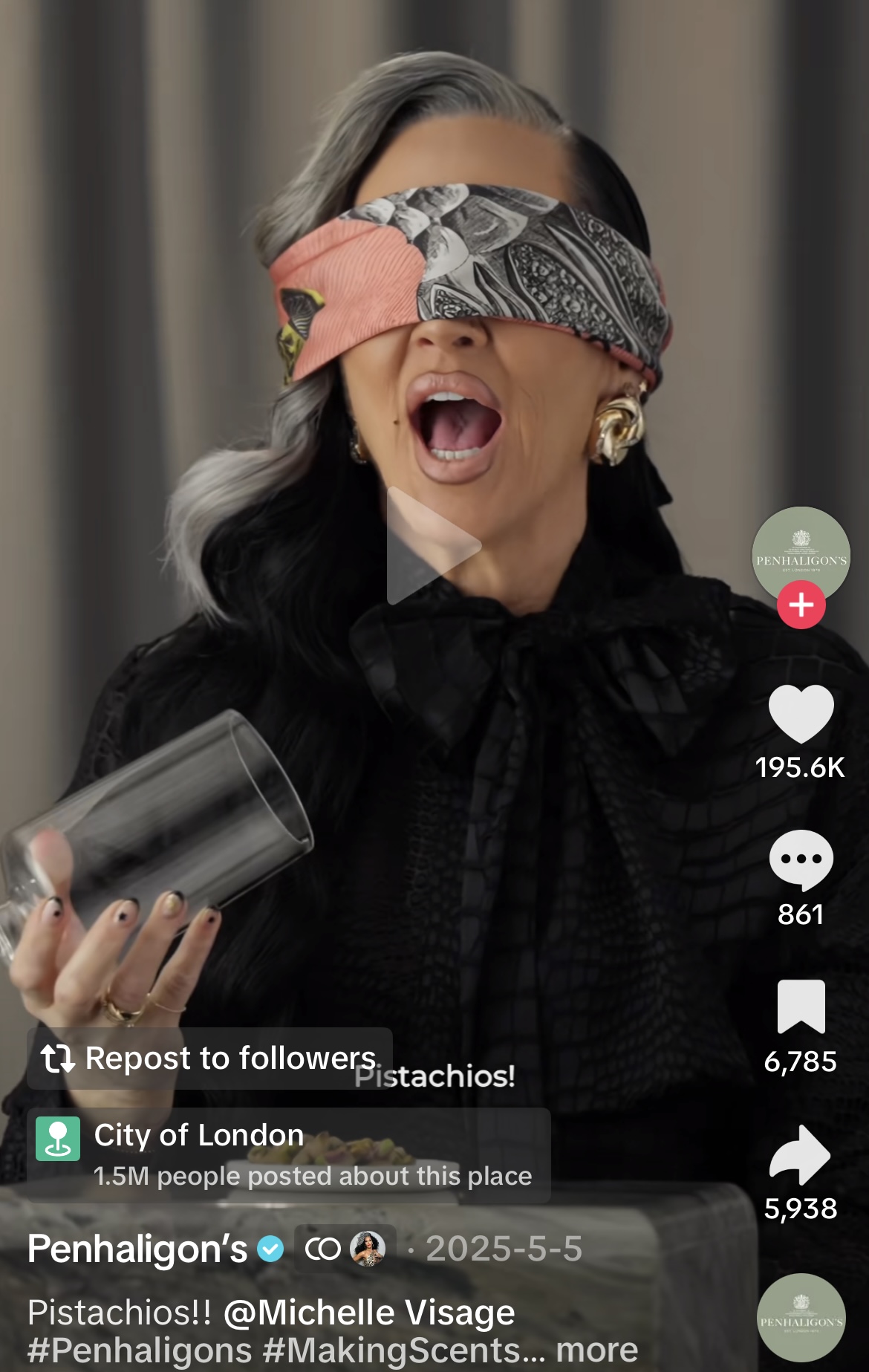Ik dus naar Michelle Visage op TikTok. Het eerste filmpje dat ik aanklik gebeurt volgens mij in samenwerking met Penhaligon’s. Geblinddoekt haalt ze een stopper omhoog, op het plateautje ligt… ‘pistachios, my god I love pistachios’. Ze zegt, schreeuwt dat ‘pistachios fragrances just have to smell like that!’ Gôh, wat toevallig Penhaligon’s Fortuitous Finley loopt ‘fortuitous’ over van pistache. Dus vraag ik op z’n Keuringsdienstvanwaarde-wantrouwig: heeft dit merk (dat goedkoop meelift op dierenkoppen-trend ingezet door Zoologist) haar de zijden blinddoek (Hermès?) voor of na het zien van de nu zo hippe, maar steeds duurder wordende noten omgedaan? Anyway: 195.6k keer geliket.