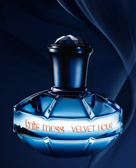 Het idee van ‘het fluwelen uur’ zie je ook terug in de flacon. Die heeft volgens Kate een vintage-uitstraling vol glamour met zijn sensuele rondingen en diepe kervingen die doen denken aan een geslepen diamant. En de blauwe fotocampagne… tja. Die lijkt qua kleur wel verdomd veel op Diors Midnight Poison uit 2007 (ook zo’n ‘spannend’ tijdstip in parfumland) en de totale aankleding maakt ‘in een vloek en een zucht’-indruk. Maar misschien hoort dat wel bij de sensuele nonchalance van Kate tijdens haar Velvet Hour.