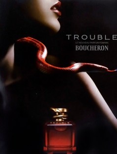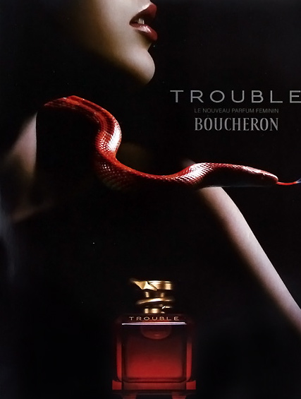 De sieraden van het in 1858 door Frédéric Boucheron opgerichte juweliershuis kunnen eigenlijk maar door één soort vrouw gedragen worden: vurige verleidsters. Want Boucheron-creaties schuwen de controverse niet en belichamen in al hun perfectie de filosofie van het huis: sensualiteit, mysterie en extravagantie. Zegt Boucheron. Een dergelijke omschrijving is ook van toepassing op Trouble. Boucheron spreekt van een liefdesdrank (en tovermiddel) waarmee gepassioneerde, onvoorspelbare maar bovenal fascinerende heldinnen op het voetstuk worden geplaatst die tradities en taboes aan hun laars lapten. Een paar namen. Gravin de Castiglione: beroemd 19de eeuwse oproerkraaister. Mata Hari: legendarische spion. Josephine Baker: superlenige cabaretdanseres. Maria Callas: dé stem van de 20ste eeuw. Marlene Dietrich: mooiste oma-actrice met de mooiste benen. Om de gevaarlijke en verwarrende (troubler betekent in het Frans verwarren) inhoud van de roodgloeiende flacon te symboliseren, wordt de dop beschermd door een kronkelende slang. Want het is niet mis wat er met je gebeurt als je Trouble opent: je dringt een barok koninkrijk binnen waar verleiding, gevaar en verlangen de scepter zwaaien. Een rijke en extravagante wereld, verlicht door kandelaars en behangen met fluweel.