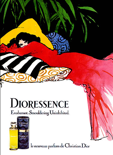 Met Dioressence gaf Dior op fantasievolle eigen wijze kleur aan deze oosterse golf. Dit was niet alleen aan de inhoud te danken, maar ook aan de manier waarop ‘huisillustrator’ René Gruau deze wereld met een trefzekere hand op papier zette. Vergeet ik bijna te vertellen dat de naam al eerder door Dior werd gebruikt voor een verzorgingslijn eind jaren zestig.