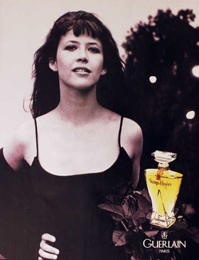 We noemen het een overgangsparfum. Niet voor de vrouw die zich in deze – best wel – moeilijke periode van het leven bevindt, wel dat de geur werd gemaakt toen Guerlain net onderdeel was geworden van LVMH, ‘s wereld grootste luxe conglomeraat. Dat betekende: elkaar verkennen en voorzichtig aftasten. Het schijnt dat de algemeen directeur hiervan, Bernard Arnault, bepaald niet gecharmeerd was over de initiële campagne: model in romantische tuin, zittend in een soort toverboom. Of het niet wat meer edgy kon? Meer nu (de smaak van toen). Meer geëmancipeerd. Minder statig. Minder tuttig. Minder ouderwets. Dus werd actrice Sophie Marceau – toen in Frankrijk een typische a-typische beauty – ingehuurd die in arty-farty zwart-wit het gevoel waar Champs-Elysées anno 1996 voor stond te verbeelden.