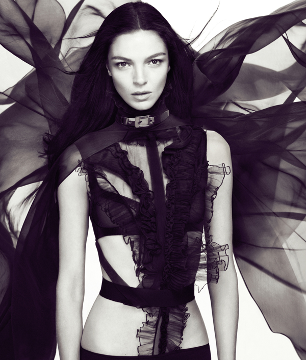 Mariacarla Boscono verschijnt als een ‘gesluierd buitenaards wezen, een godin van mystieke tempels, een zwarte engel gehuld in leer, chiffon en zijde, als een zwarte dahlia die met haar androgyne charme alle zintuigen beroert’.
