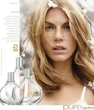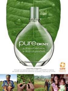 En dat zonder gebruik te maken van het cologne-recept. Op de tweede plaats doet de gebruikster tegelijkertijd iets goeds: want de verbena in deze geur is afkomstig van plantages uit Togo waar, naar het schijnt, vooral de vrouwen voor de inkomsten zorgen. Doordat Donna Karan (in samenwerking met stichting Care) met deze vrouwen een lange termijn-deal maakt, zijn die hier de komende tijd van verzekerd, en zo – nu volgt de slogan – ‘wordt een druppel Afrikaanse verbena, een druppel goodwill’. En: de druppelvormige flacon (als symbool van puurheid) is gemaakt van gerecycled glas, de verpakking van duurzaam gefabriceerd, composteerbaar karton (in een fabriek dat werkt met 100 procent ‘renewable’ energie).
