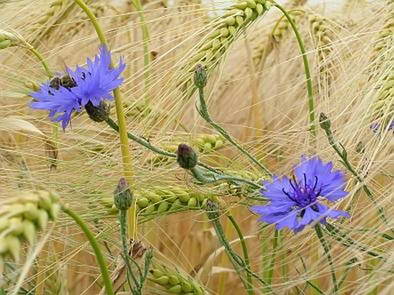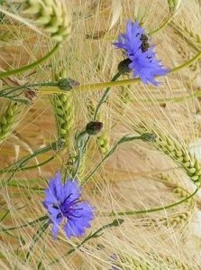 … klaproos, weegbree, zuring, een verdwaalde margriet, zo’n merkwaardig paarsblauw bloemetje – naam weet ik niet meer – dat zich om de aren draait en zich daaraan vastkleeft, en natuurlijk de bloem gekleurd met het meest intense blauw denkbaar (alleen de gentiaan kan zich met haar meten) en haar naam er aan dankt: korenbloem.