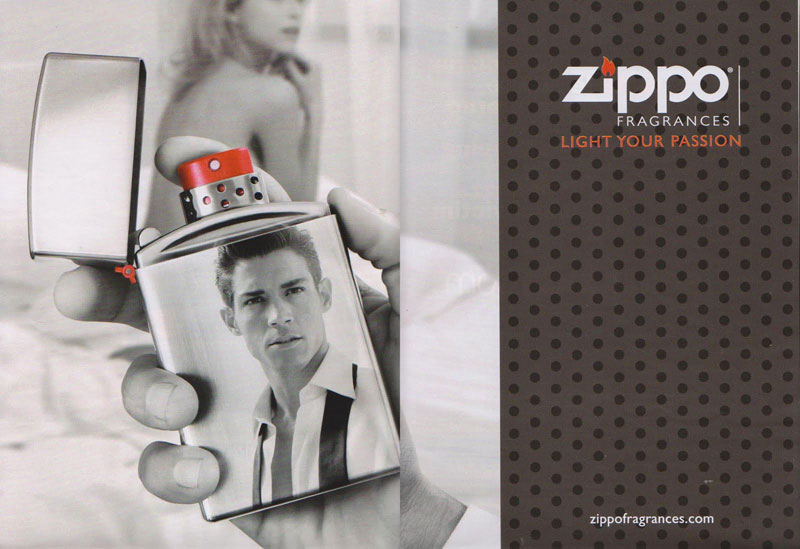 Samen met jeans, wit T-shirt en leren motorjack hoort de Zippo bij de basic rock and roll-look van the cool american guy, the rebel without a cause, gesymboliseerd door James Dean (1931-1955). Maar om Zippo als cultmerk en het geluid ervan als iconisch te bestempelen… Het is gewoon een speeltje waar veel mannen leuke herinneringen aan hebben. Dus waarom de aansteker niet koppelen aan een geur? Of meerdere? Is dus gebeurd: zie www.zippofragrances. Zelfs aan vrouwen is gedacht.
