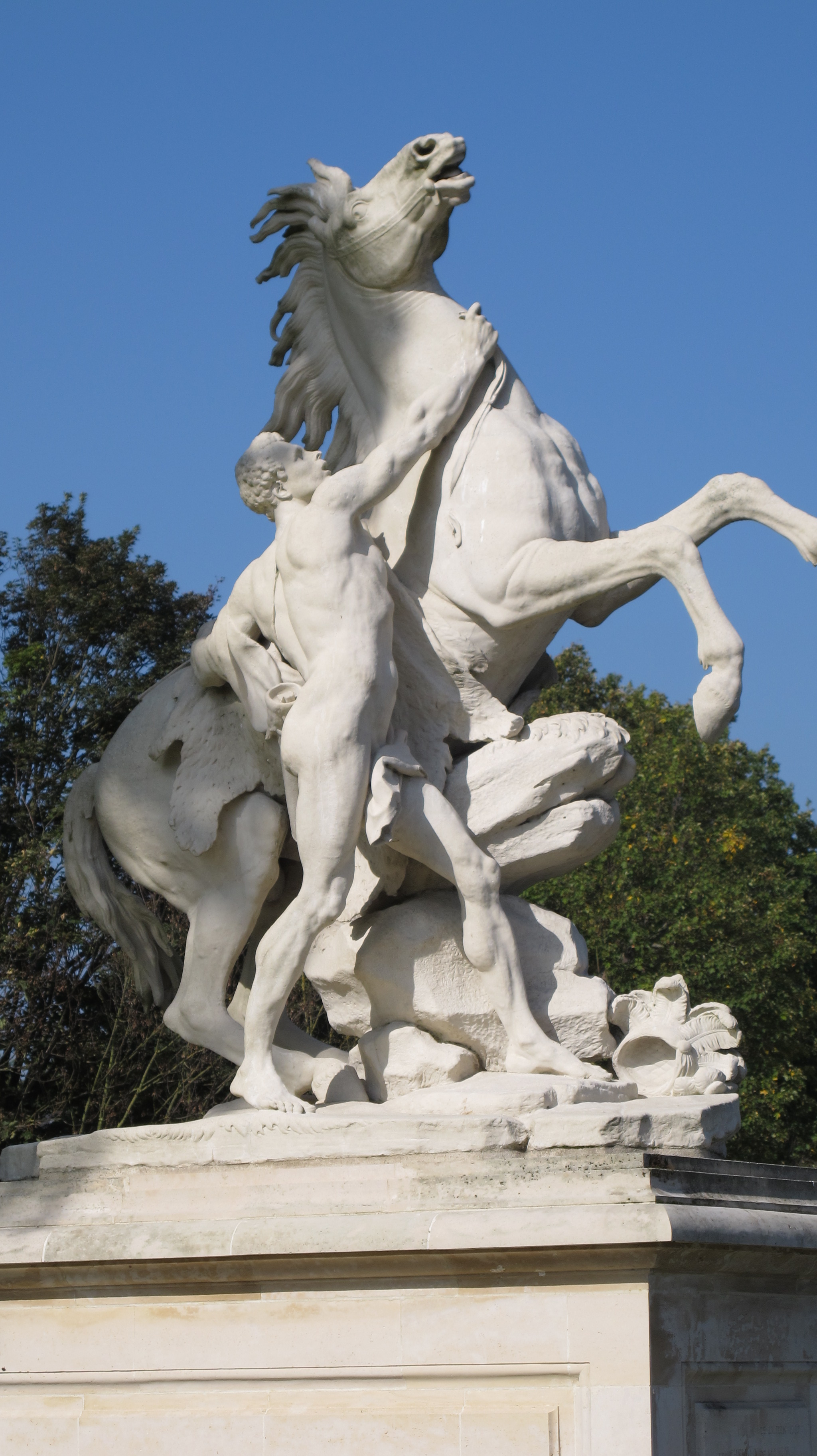 Dit is barokke beeldhouwkunst op zijn meest spectaculair: de Paardenmenners van Guillaume Coustou (1677-1746). Vol zwier, vol beweging en technisch gezien van een adembenemende allure. Hoe krijg je het voor elkaar? Er zit zoveel dynamiek in; alsof de beeldhouwer telkens paard plus menner op het moment surprême heeft bevroren.