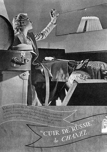 De tweede is mijn favoriet en sinds ik het parfumextract ken nog meer. Waarom? Afgezien van de geur ook omdat het voor mij symbolisch het dichtst in de buurt komt van Gabrielle Chanels onorthodoxe karakter. Cuir de Russie is voor mij de beste ‘celebrity fragrance’ ever omdat inhoud en persoon één zijn: beide tegen de conventies is, spelend met clichés van mannelijk en vrouwelijk. Want het leerthema was in de jaren twintig van de vorige eeuw al populair, maar voornamelijk bij mannen. Het sloot naadloos aan bij haar ‘kleed-filosofie’: de klassieke mannelijke garberobe omzetten naar een draagbare collectie voor de vrouw. Een leergeur slot hier naadloos op aan.