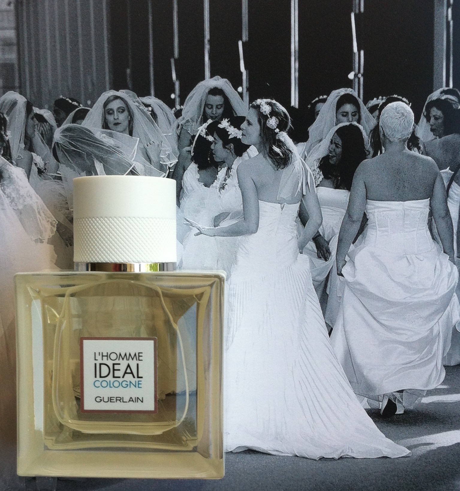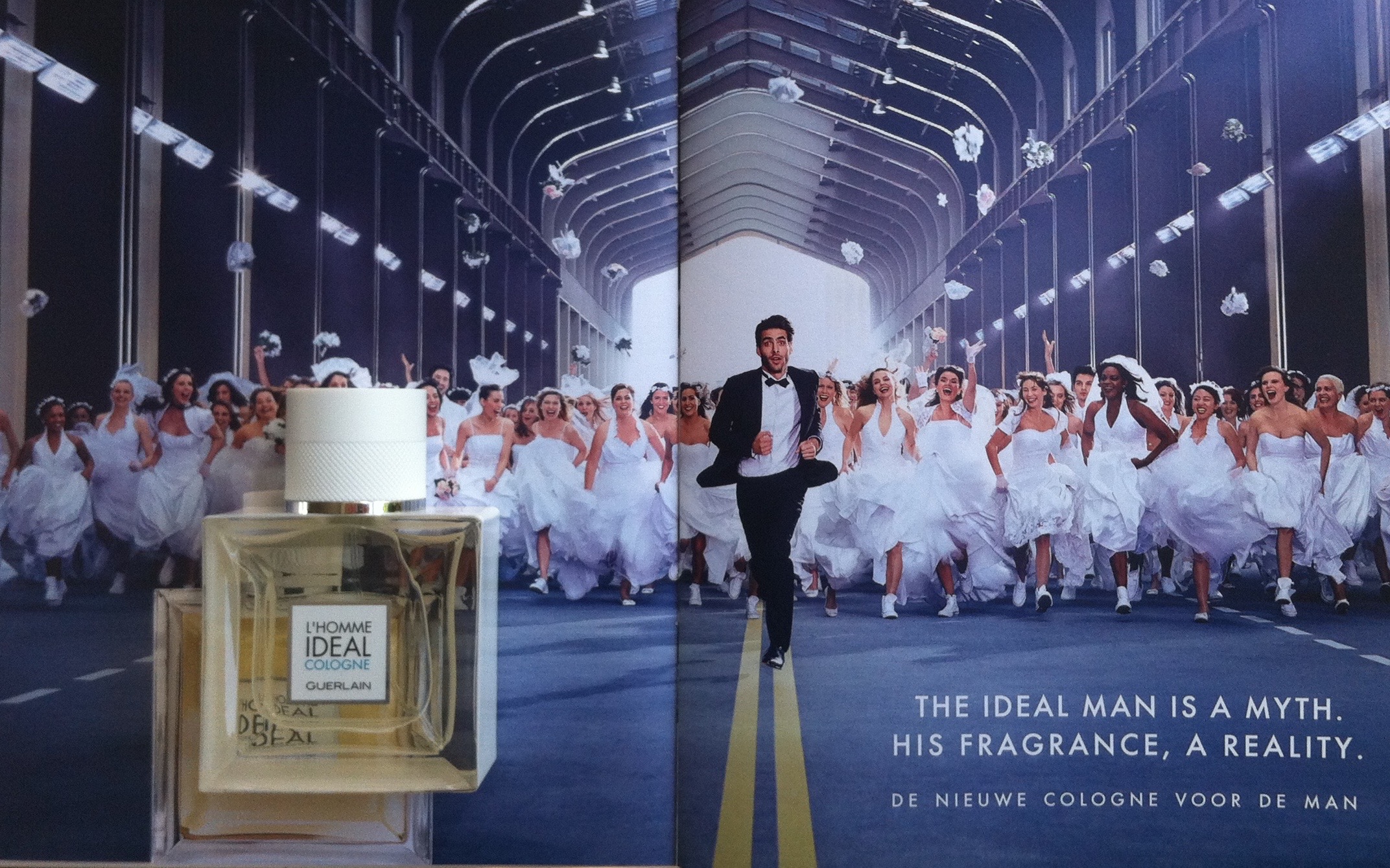 En wat wordt er weer veel aandacht besteed aan de presentatie: naast een ‘interview’ met Wasser, ook een backstage-verslag van ‘de bruiden die achter de ideale man aan rennen’. Dat zijn dus – wel weer grappig – 160 medewerksters van Guerlain voor de gelegenheid verkleed als bruiden (lijkt me logisch). Grappige bij-effect: het blijkt een chique variatie op de campagnes van het merk dat alleen met ‘doe-maar-gewoon-dan-doe-je-al-gek genoeg’-douchegels en deodorants horden vrouwen het hoofd op hol brengt en hun harten te dol van geilerige begeerte maakt: Axe.