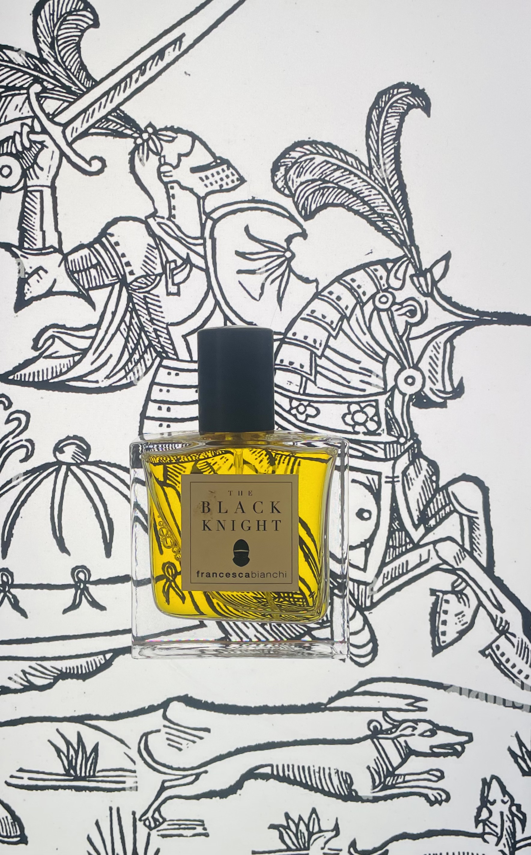 The Black Knight: toen ik de naam van de geur las… was ik direct getriggerd. Dat heeft, zoals zo vaak met geuren, een persoonlijke link. De eerste vintage-geur die ik op een rommelmarkt kocht, zal begin 2000 zijn geweest, heette Le Chevalier Noir. Jaren vijftig-werk denk ik in een klein onbeduidend 30mlflesje – kwijtgeraakt inmiddels en niet op www te vinden. Met sierlijk-zwierige belettering. Hoe de geur rook? Kruidig-aromatisch. Zoiets.