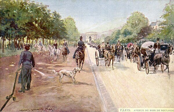 In een Guy de Maupassant-stemming, waan ik me in een fiacre op de Parijse boulevards richting Bois de Boulogne. Geen zin om naar de kerk te gaan. Laat de klokken maar beieren. Ik hoor het gebries en gehinnik (tuig geleverd door Hermès bien entendu) van de paarden – onwennig als ze nog zijn aan auto’s. Het geklik-klak van hun beslagen voeten op de kasseien. Is dat een vermanend fluitje – tussen het geroezemoes van wandelaars door – van een gendarme die het ook niet meer weet? Jeetje. Het lijkt wel of die zwerm duiven me achtervolgt, hoe sierlijk zoeven ze voorbij….