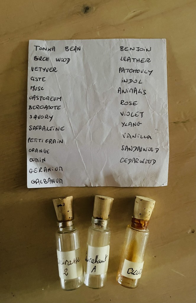 Ik vraag me wel eens af: ben ik niet te enthousiast, heb ik een blinde vlek voor haar ontwikkeld? Is het dat ik haar persoonlijk kende? Mona is bezig geweest om voor mij een parfum op maat te maken. Ik wou een schreeuwende leergeur in overdrive – ze begreep de woordspelingen direct bij de namen die ik in gedachten had: Cuirasse en Cuirrelant. Er volgden drie proeven. Bij de laatste keer gaf ze met het recept (zonder de hoeveelheid per ingrediënt) om mij duidelijk te maken wat er allemaal achter een geur stak. Tjonge, tjonge, wat rook het veelbelovend. Heel erg helaas is het er niet meer van gekomen. Ik bewaar het ‘manuscript’ bijna als een relikwie.