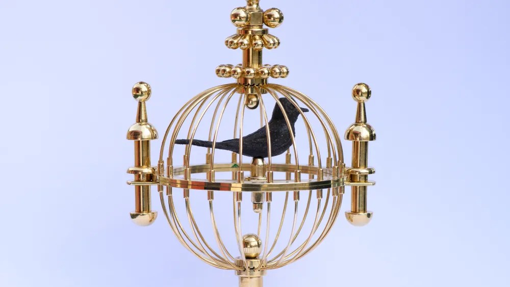 De vogel op de begeleidende foto’s is ontworpen door – nu volgt een cliché; in dit geval wel passend gezien de naam van de maker – niemand minder dan Leonardo da Vinci waarvan de originele schetsen zich bevinden in de Codex Atlanticus. De bolvormige kooi kon in het interieur worden geplaatst, maar afhankelijk van de grootte, ook aan een ceintuur worden bevestigd.