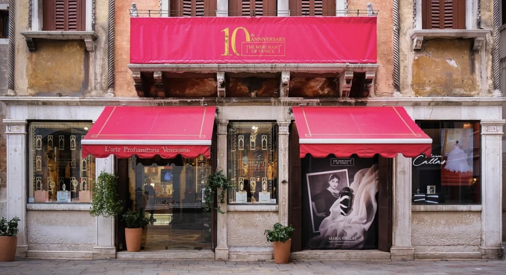 Dit artikel wordt onderbroken door een commerciële boodschap: ‘Vrijwel recht tegenover het theater kunt u de boetiek The Merchant of Venice bezoeken in Campo San Fantin. Deze fantastische flagshipstore, werkelijk uniek, is gevestigd in een prachtige 17de-eeuwse apotheek die in 1846 in zijn huidige vorm werd ingericht door architect Gianbattista Meduna, verantwoordelijk voor de wederopbouw van het Teatro La Fenice na de brand van 1836’.