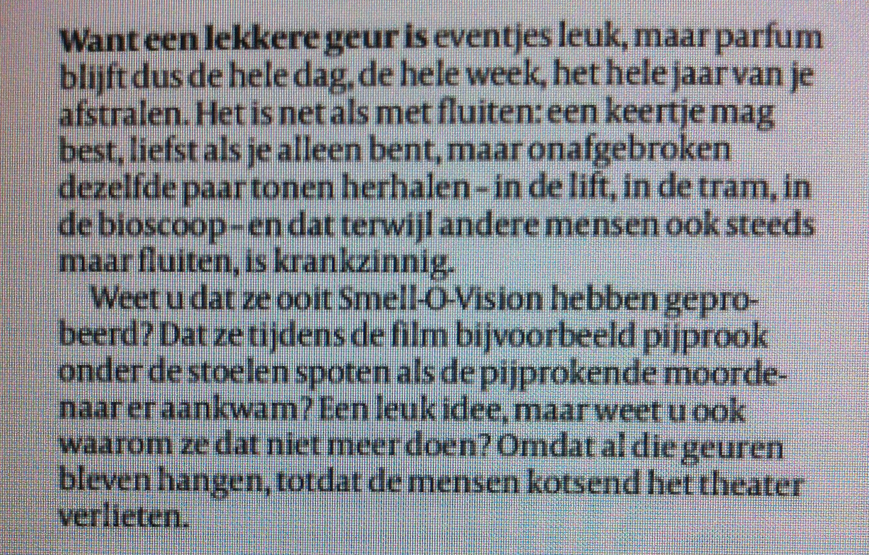 De verantwoording van Parfumado – ‘Het aanbod blijft jaarlijks groeien, in parfumeries wordt zóveel gespoten dat alles op elkaar lijkt en een langere periode van testen wordt nergens aangeboden’ – gaat scheef. Je ‘moet’ nooit meer dan vijf geuren – ik ga voor drie – tegelijk proberen. Als je ze daarna op je polsen hebt gespoten, loop je naar buiten om ze op je te laten inwerken. En: als je echt wil, kun je in elke parfumerie zo lang testen als je wilt – neem de Bijenkorf. En een ‘beetje parfumerie’ heeft tegenwoordig een luchtverfrisinstallatie. Het (wel of niet adequate) personeel (dat na drie testen weliswaar vaak het geduld begint te verliezen) helpt je in ieder geval graag verder. En vallen de verkooppraatjes tegen, zijn die niet om aan te horen? Ga je toch online. Bestel je bijvoorbeeld bij Ici Paris XL dan krijg je er gratis proefjes bij.