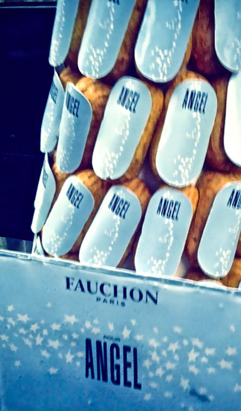 Dat zie je terug op de verpakking: ‘Is geïnspireerd op traditioneel luxe snoepgoed’. Dat ‘voel’ je terug op de flacon: ‘Bestrooid met suiker lijkt die veranderd in een onweerstaanbare lekkernij’. Ik heb begrepen dat Thierry Mugler, om tot deze variatie te komen, ook de hulp heeft ingeroepen van een van de meest beroemde patisseurs van Parijs: Fauchon. Die heeft voor de gelegenheid de klassieke éclair een Angel-behandeling heeft gegeven.